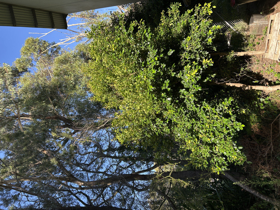 A vibrant outdoor scene features various trees under a bright blue sky. One tree, possibly a pine, displays intricate branch patterns. Another, a lush green tree with dense foliage, dominates the right side of the image. Wooden planks are visible on the ground, alongside a fence, suggesting a garden or backyard setting. Part of a roof is seen at the top left, hinting at a nearby building.