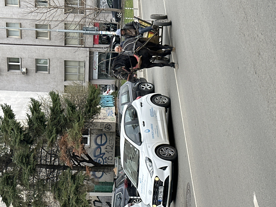 The image captures an urban street scene in Sofia, Bulgaria. In the foreground, a white Hyundai i10 hatchback, bearing Bulgarian license plate CB 1780 TB, is positioned on an asphalt road. The vehicle is branded with "KANDILAROV" and a water droplet logo, along with Cyrillic text indicating "ДОМАШНИ ПОСЕЩЕНИЯ" (home visits). To the right of the Hyundai, a black horse pulls a two-wheeled cart. Two adult males occupy the cart; the front male, dressed in a light shirt and dark vest, holds the reins, while the rear male wears a dark, hooded jacket. In the background, on the right side of the street, stands a multi-story, light-grey building featuring numerous windows, balconies, and air conditioning units. Its ground floor includes commercial storefronts, one labeled "Carouse" and another partially visible as "SALO[N]". On the left side of the street, behind parked vehicles, a smaller, grungier building is visible, covered in graffiti including "ope", "18.12", and an anarchy symbol. This building is partially obscured by a large coniferous tree and a bare-branched deciduous tree. A street light pole is visible on the right. The overall lighting suggests an overcast day.