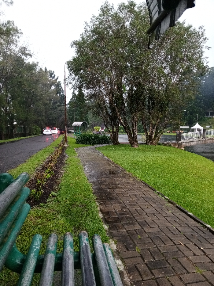 A park path, paved with rectangular bricks, curves right past a grassy area. Trees line the edge of the path, and a road runs parallel to it on the left. Two cars are seen on the road. A green park bench sits in the foreground, while a shelter and a white fence are visible along the water on the right. The scene appears overcast.