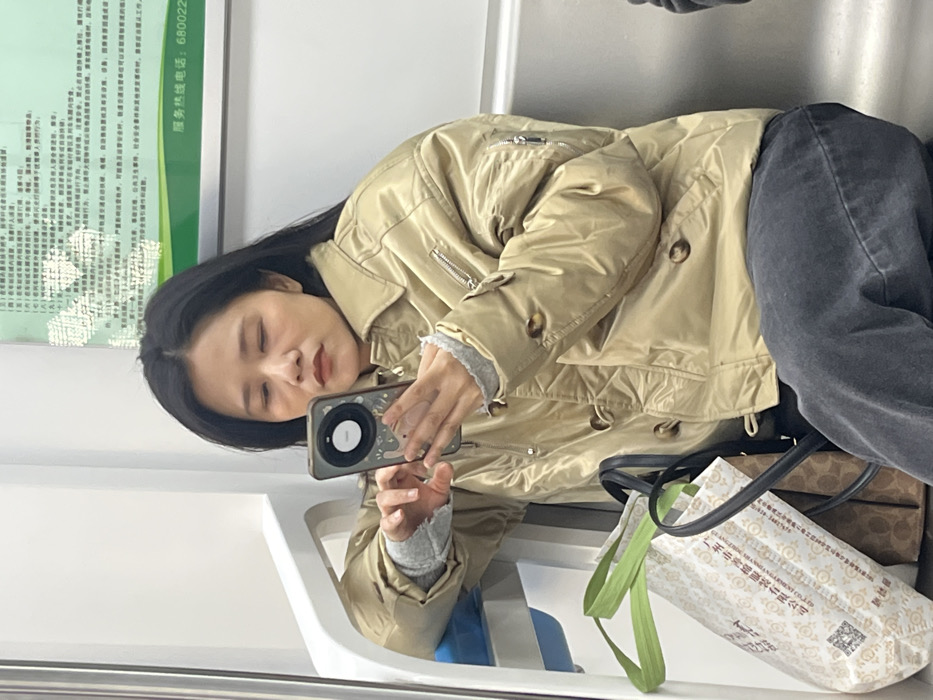 A woman on public transit holds a smartphone, possibly taking a selfie. She has long dark hair and is wearing a tan jacket over a gray top and dark jeans. Beside her is a white shopping bag with green handles, which sits on top of a brown handbag. The interior of the transit vehicle is visible, with a white wall and overhead signage.