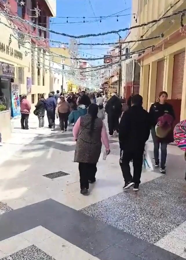 The video depicts a bustling pedestrian street, lined with buildings and adorned with festive decorations overhead. A diverse group of people stroll along the sidewalk, some engaged in conversation, others appearing to be window shopping. The buildings on either side of the street are multi-story, with visible signage and architectural details. The sky is clear and blue, suggesting a bright day. A building on the left of the screen is identified as the "Casa de la Cultura". The sidewalk is patterned with a combination of light and dark paving stones. Overall, the video captures a vibrant street scene with a mix of pedestrian traffic and holiday ambiance.