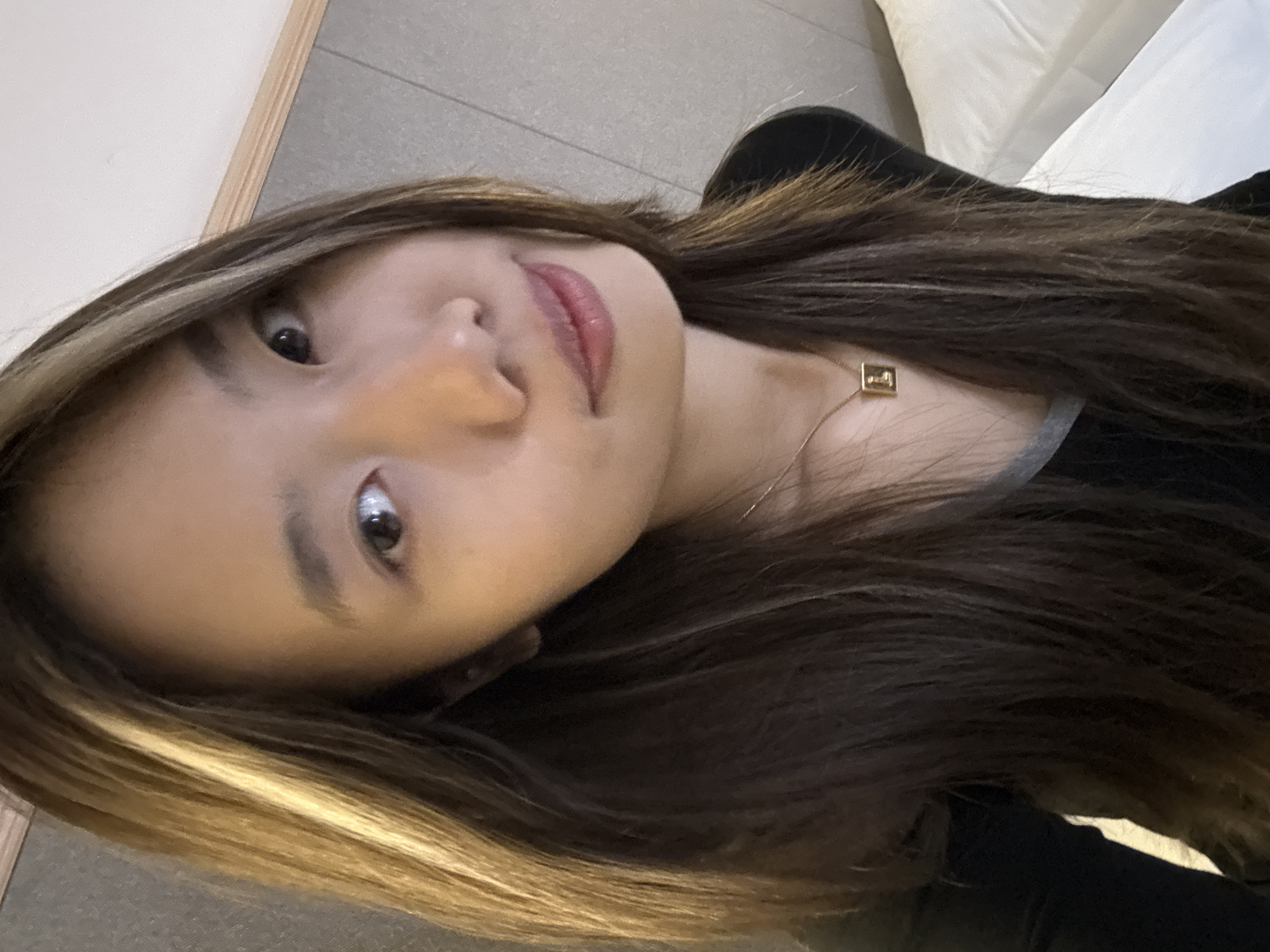 A close-up selfie of an Asian woman is the main subject. She is likely indoors, as suggested by the interior setting. Her hair is long and brown with blonde highlights. She is wearing a dark-colored shirt and a gold necklace with a small, square pendant. The background includes a white surface, potentially a pillow or bedding, and a gray surface, possibly a floor or wall. There is no information present indicating location in Yuzhong District, China.