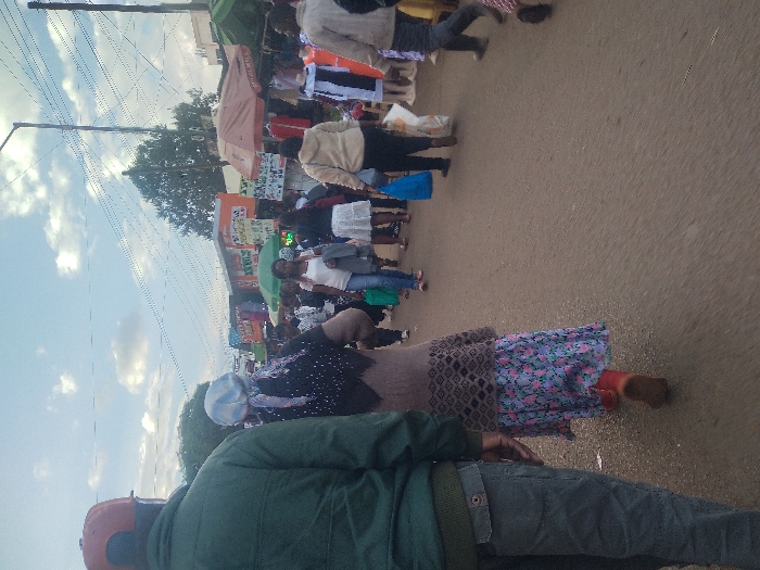 A street scene filled with numerous people walking and shopping. Various stalls and vendors line the side of the street, displaying merchandise. The sky is visible, with some clouds. Utility poles and wires are also present. The scene seems to capture a busy, crowded marketplace or commercial area. A person in a green jacket and orange safety gear stands in the foreground.
