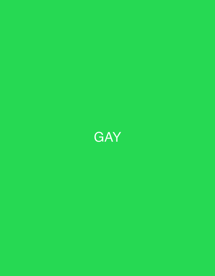 A vertically oriented digital image features a uniform bright green background, specifically the color #30D158 (RGB: 48, 209, 88). Centered horizontally and vertically on this background, the word "GAY" is rendered in white, uppercase, sans-serif text. No people, physical objects, actions, or interactions are depicted within the image. The environment is entirely abstract. The location within Simeonovgrad, Bulgaria, is not discernible from the provided image content.