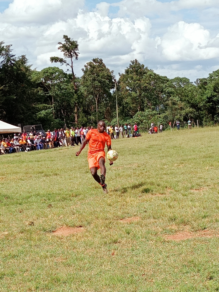 The image depicts an outdoor daytime scene of a soccer match or training session in Ngenyilel ward, Kenya