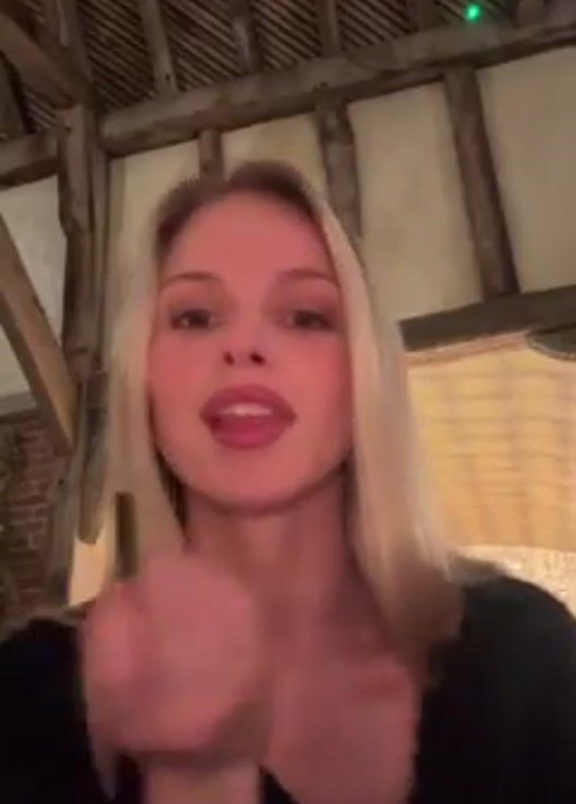 A young, light-skinned blonde woman in a black top is applying lip liner