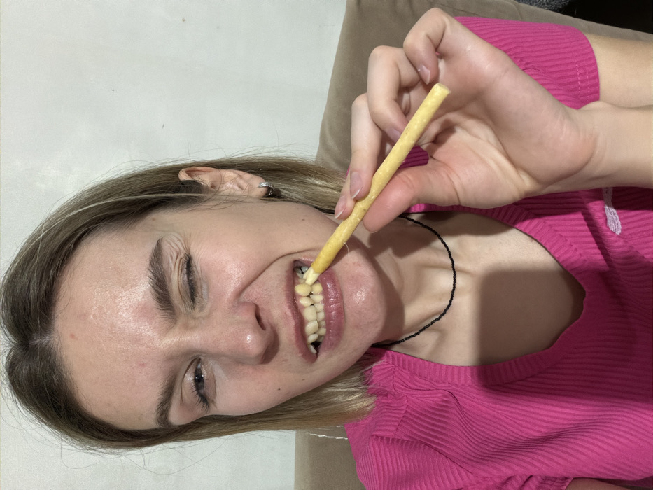 A female subject, likely a young adult with light hair, is depicted in a close-up, chest-up shot indoors in Chaikovsky, Russia. She is wearing a bright pink ribbed V-neck short-sleeved top and a thin black beaded necklace. A silver hoop earring is visible in her right ear. The subject is actively biting or chewing on a yellowish, elongated, cylindrical object, consistent with a miswak or dental chewing stick, holding it with the thumb and index finger of her right hand. Her facial expression shows her winking her right eye, with visible lines around the eye, and her mouth is open, revealing her teeth engaged with the object. The background features a plain, light-colored wall and a segment of brown upholstered furniture, likely a sofa or chair. The scene is lit by artificial light.