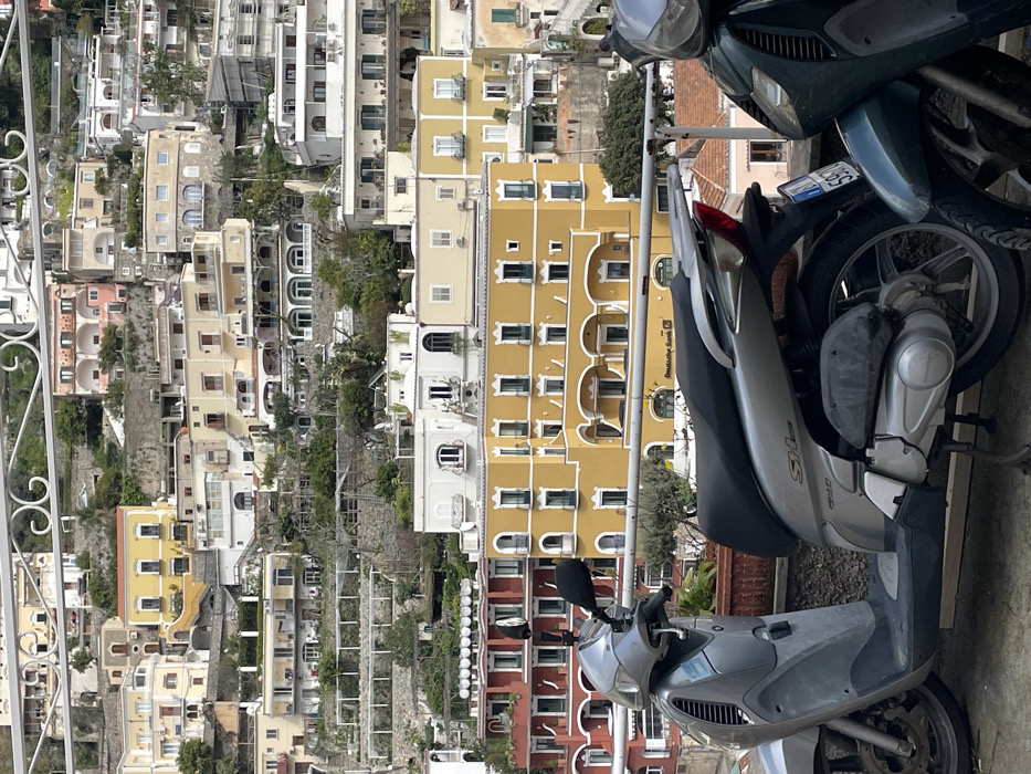 The image displays a densely packed urban landscape characterized by multi-story buildings cascading down a steep hillside, viewed from an elevated perspective within the city of Arienzo, Italy. In the immediate foreground, two scooters are parked behind a white ornate metal railing. The scooter on the left is silver, identifiable as a Honda SH model, with its left side profile, front wheel, disc brake, and engine visible. The scooter on the right is dark teal/green, showing only its front wheel and fender, with a white European license plate displaying "5970". A brown planter containing sparse green foliage is situated between the two vehicles. In the midground, a prominent mustard-yellow multi-story building with numerous arched windows and white decorative banding is central, featuring a "Deutsche Bank" sign on its lower facade. To its left, a multi-story red building with multiple windows and balconies is visible. The background consists of the steep hillside densely covered with a multitude of residential and commercial structures. These buildings exhibit various architectural styles and are painted in a range of colors, including white, yellow, beige, terracotta, and pink, interspersed with terraced gardens and scattered green vegetation.