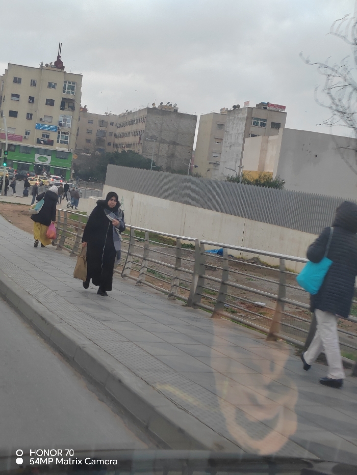 A street scene under an overcast sky depicts three women walking on a tiled sidewalk. One is wearing a black coat and carrying a brown bag. Another woman is walking in front and is wearing a yellow skirt. The third woman is wearing a black jacket, carrying a blue bag and is walking on the right. Buildings, possibly apartments, line the street in the background with visible satellite dishes. A barrier of metal railings separates the sidewalk from an area below.