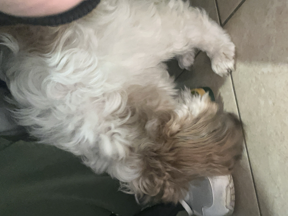 A fluffy, white and tan dog lays mostly on someone's lap, its head near their shoe. The dog has a curled coat. The background is a tiled floor with visible grout lines. The person's clothing is green, with a dark neckline showing. The shoe is white with gray accents. The dog seems to be resting comfortably.