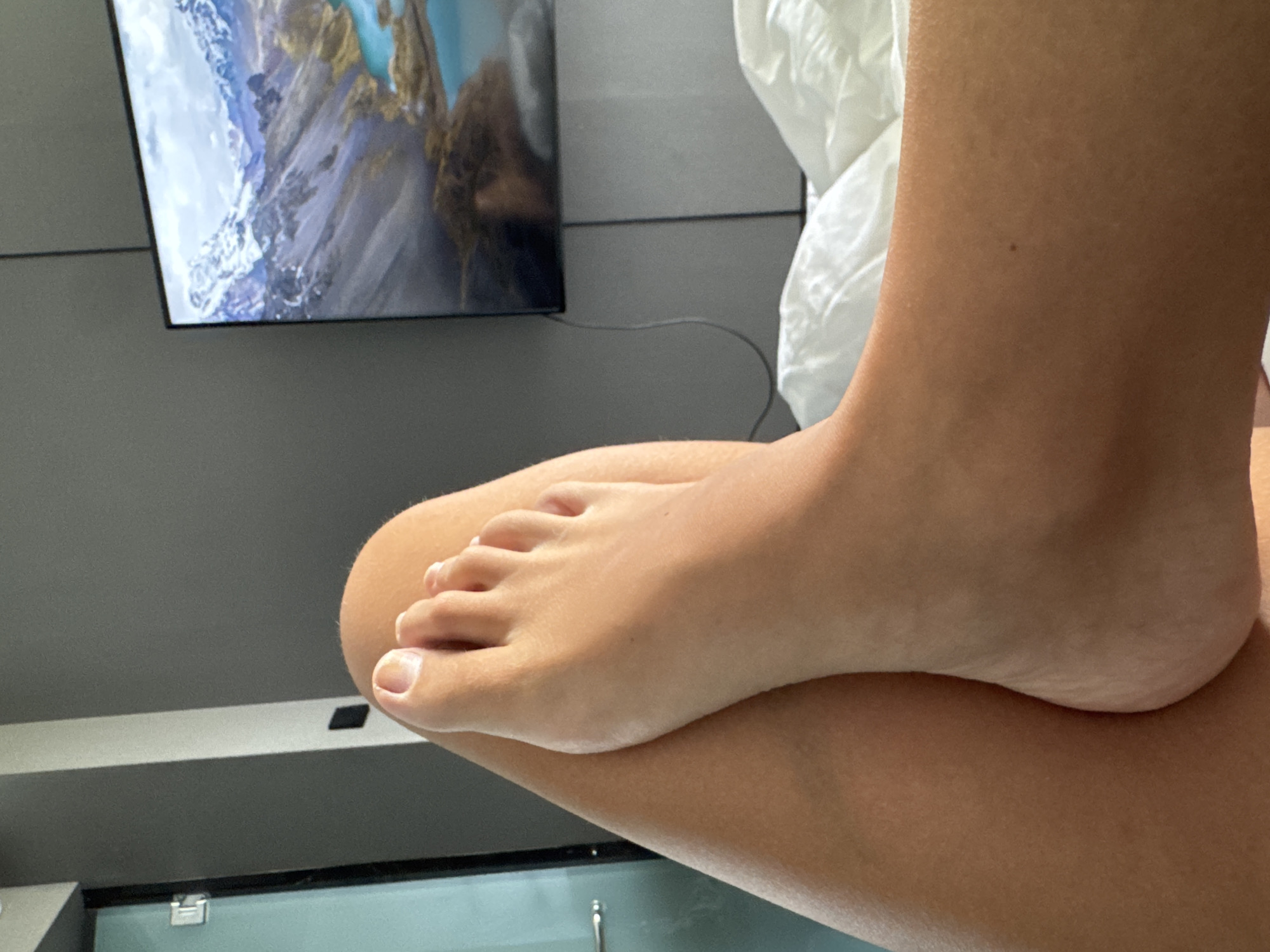 A close-up shot shows a tan-skinned foot resting on a leg