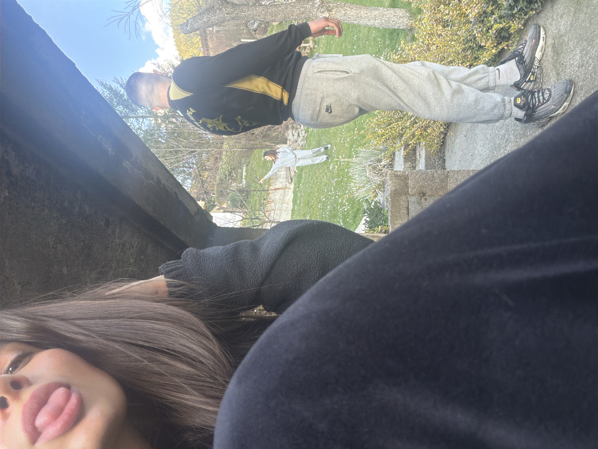 view from an elevated position, potentially a rooftop or high ledge. In the foreground, a person with brown hair is partially visible, with a portion of their face and exposed tongue. They are wearing a dark-colored top. Beyond the immediate foreground, the scene opens to a grassy area. A man is standing on what appears to be a stone wall, wearing gray sweatpants with a Nike logo, a black and gold jacket, and black and gray sneakers. In the background, another person is standing in the grassy area, wearing a light-colored outfit and extending their arms. The area appears to be a park or garden. Based on the prompt, the location is Rudartsi, Bulgaria. The image depicts people interacting in an outdoor environment, with one person on an elevated position and another on the ground.
