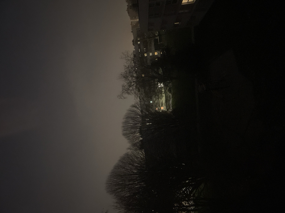 nighttime urban landscape with heavy fog or smog. Buildings with illuminated windows are visible in the background. Several trees, appearing dark and bare, dominate the midground. The overall scene is dark and obscured by the atmospheric conditions. The composition is vertically oriented.