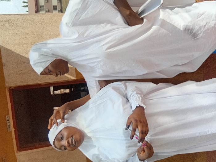 Two women in white robes and head coverings stand outdoors near a building. One woman smiles and holds a small pink and white item in her hands, while the other looks downward. The building is light tan or beige, and a window is visible to the left. Part of a building is also visible in the background. The image is rotated, giving a slightly off-kilter perspective.