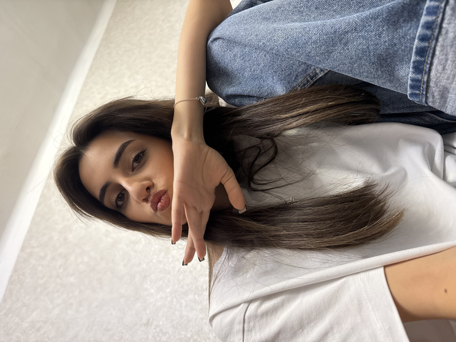 The image displays a close-up, chest-up portrait of a single female individual. She has long, dark brown hair, dark eyes, and light-medium skin tone. Her lips are puckered in a "kiss" expression, and she looks directly at the camera. Her left hand, with fingernails painted dark, is positioned across her lower face, partially obscuring her chin and mouth, with fingers slightly splayed. She wears a loose-fitting white short-sleeved t-shirt. A thin silver chain necklace with a small silver cross pendant is visible on her chest, below her neck. A thin silver bracelet with a small charm is present on her right wrist. The fabric of light blue denim jeans is visible on the right side of the frame. The background consists of a plain, light-colored wall with a subtle textured pattern. The lighting is even and consistent with an indoor environment. This scene is situated indoors in Yerevan, Armenia; no specific external landmarks are visible within the frame.