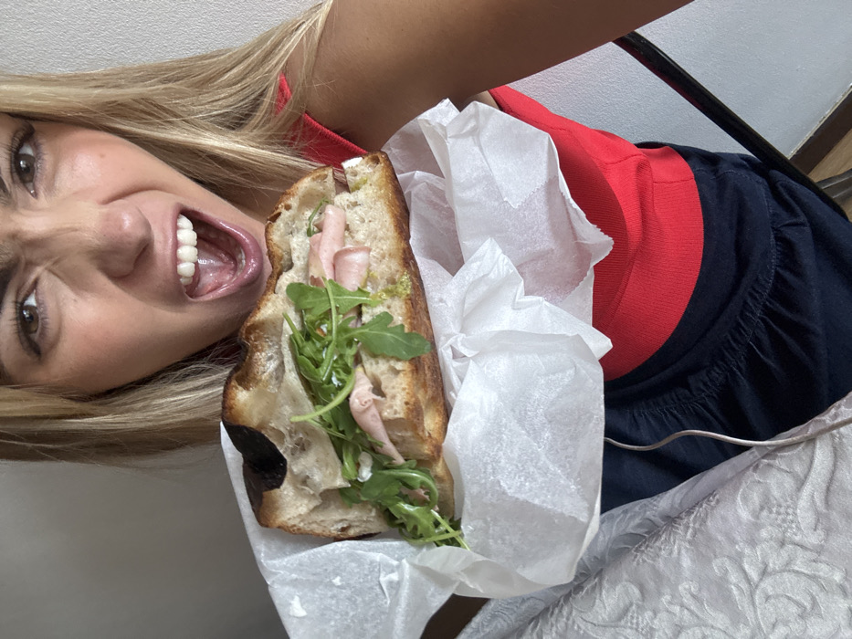 An indoor, close-up image features a blonde-haired female holding a large sandwich. She wears a red sleeveless top and dark blue bottoms. Her face displays an exaggerated expression of eagerness, with wide-open eyes, furrowed brows, and a widely agape mouth revealing her upper and lower teeth and the back of her throat. The sandwich, held directly in front of her, is crafted with rustic, artisanal bread, containing thinly sliced, light pink cured meat (likely mortadella), green arugula leaves, and a pale green or white spread. It is partially encased in crumpled white paper. In the lower left foreground, a section of a table covered with a light-colored, patterned tablecloth is visible. A dark chair frame is partially visible in the lower right, next to a plain light-colored wall. The exact location in Porto, Portugal, cannot be determined from the provided image.