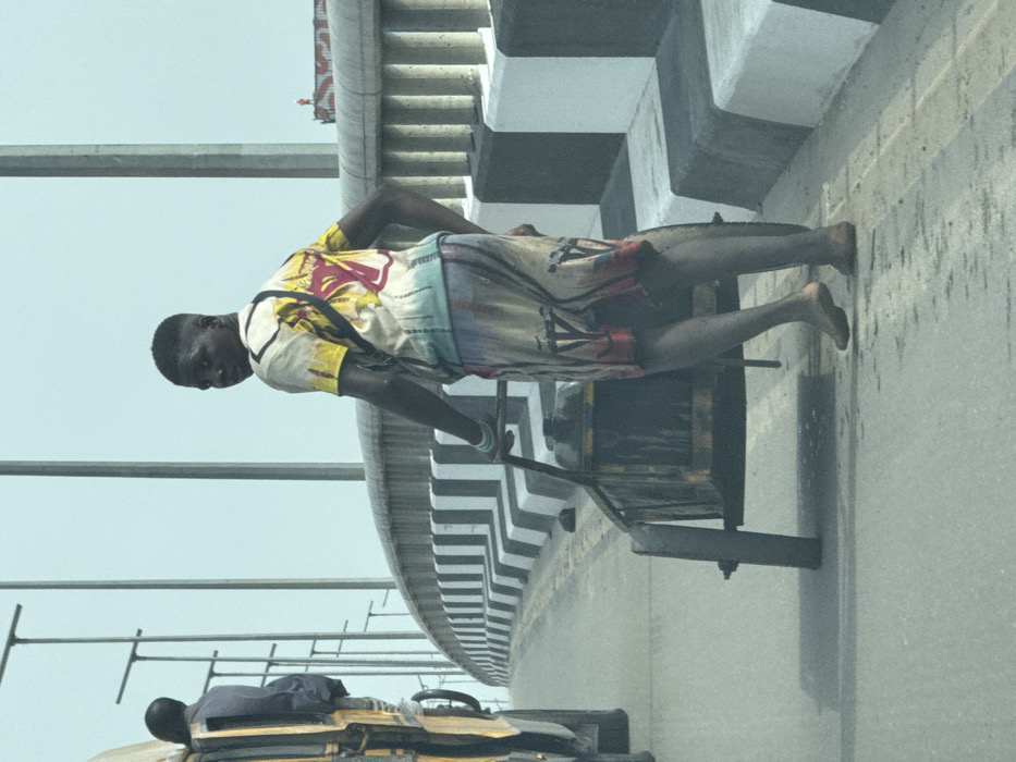 The image depicts a scene on a concrete bridge road in Ebute-Metta, Nigeria, under a hazy light-blue sky