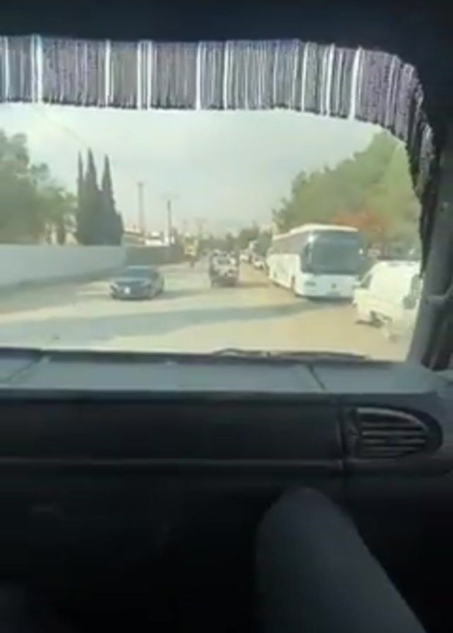 From inside a vehicle, likely a car or truck given the dashboard view, the video shows a street scene in what appears to be a Middle Eastern or Mediterranean setting. There is traffic, including a white tour bus, a dark sedan, and a small truck with some sort of cargo. Power lines are visible, and there are green trees on the sides of the road. A distant hill or mountain is visible under a hazy sky. A person's leg is briefly visible in the lower right of the frame.