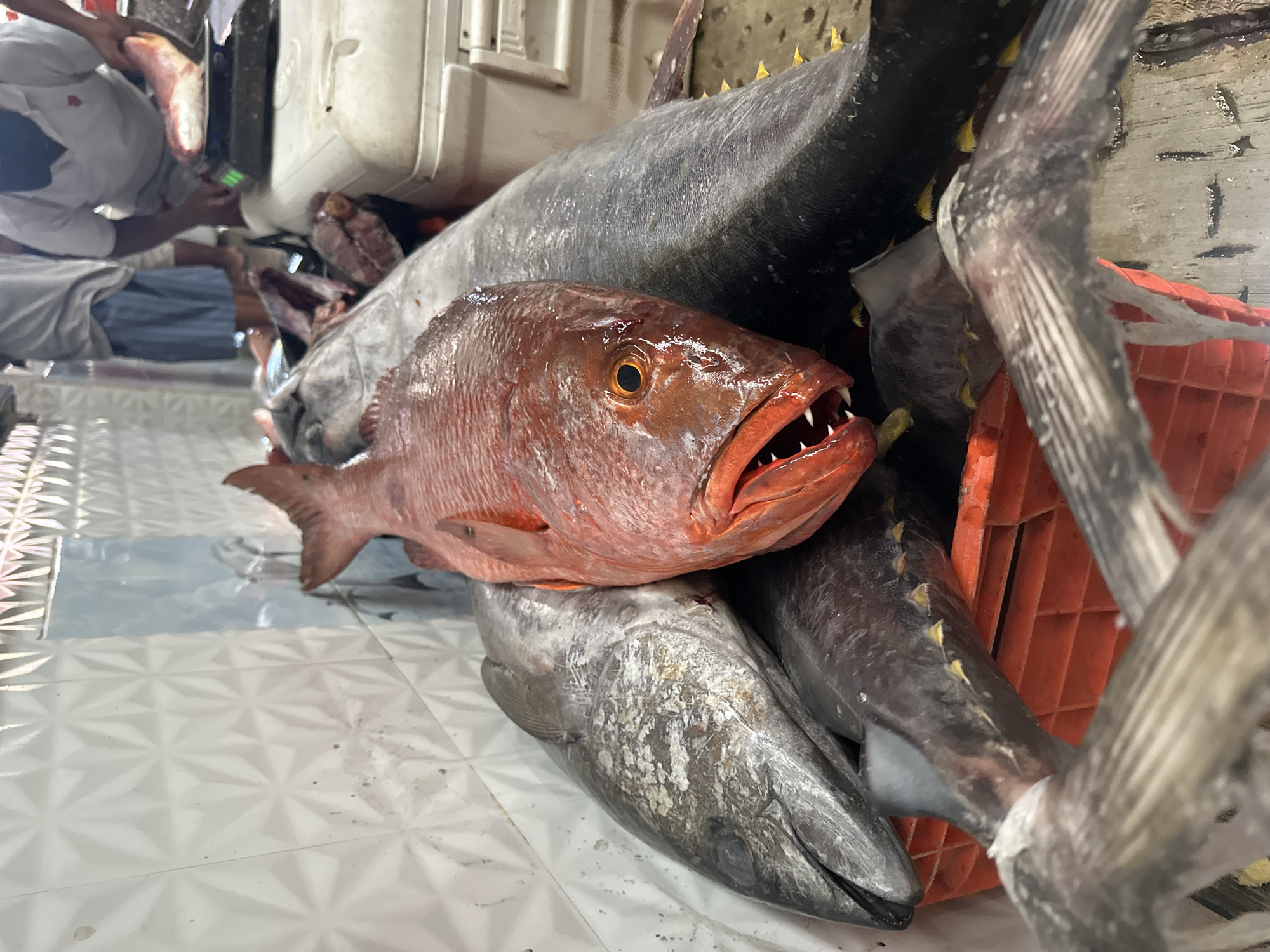 pile of dead fish in what appears to be a fish market, likely in Puerto Escondido, Mexico. A red snapper with bared teeth is prominently displayed on top of several other fish, including what appear to be tuna. An orange plastic crate is visible amongst the fish. In the background, a person is weighing a fish on a scale. The floor is tiled with a geometric pattern. A portion of a white cooler is also visible.