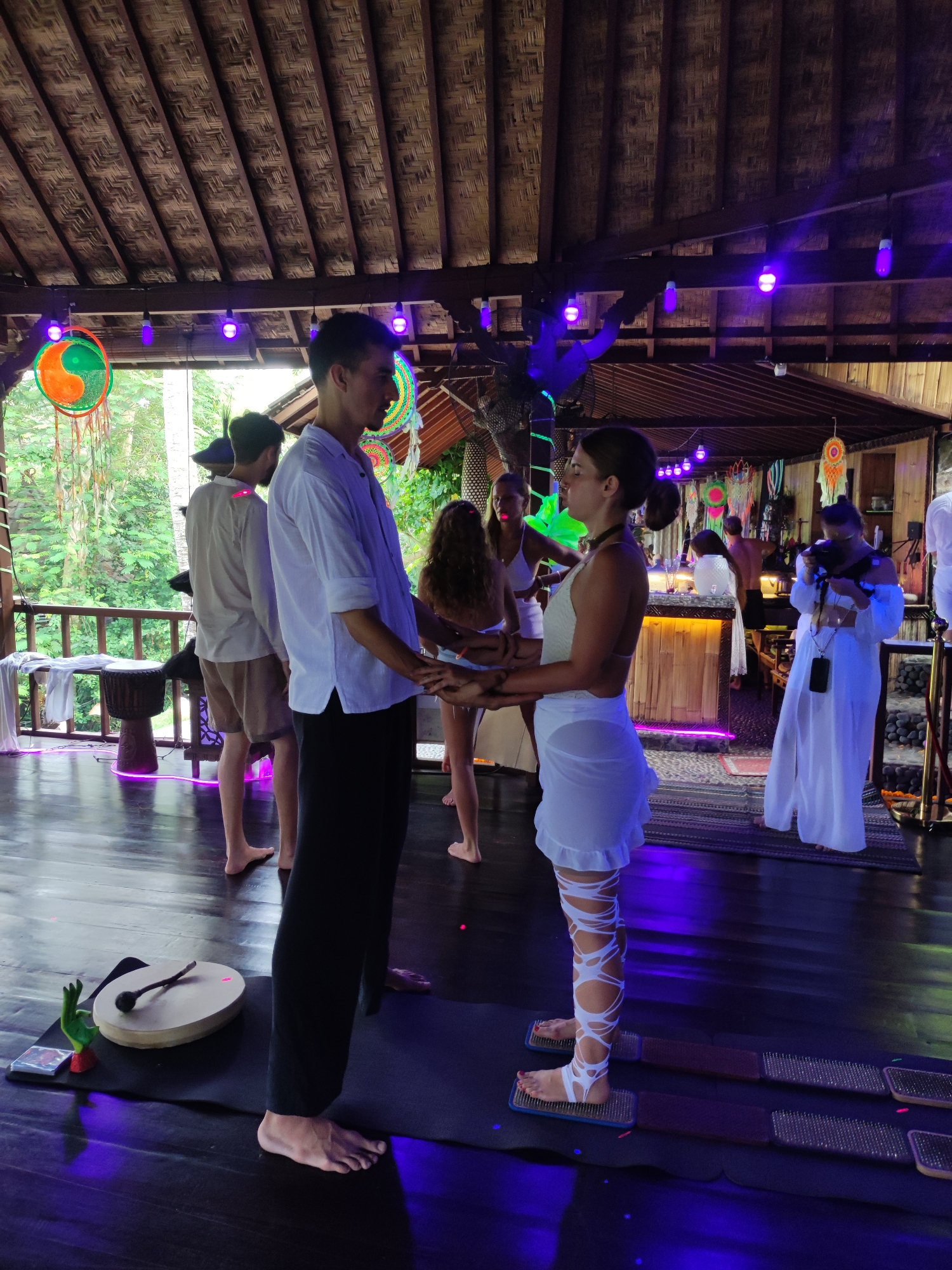 The image depicts an indoor-outdoor spiritual or wellness gathering at a venue in Lokaserena, Indonesia. The scene is illuminated by ambient purple lighting from hanging bulbs, originating from a thatched ceiling. The main focus is on a man and a woman in the foreground, standing barefoot on a dark wooden floor, facing each other and holding hands. The man, positioned left, has fair skin and dark hair. He wears a white, rolled-sleeve collared shirt and dark trousers. The woman, to his right, has fair skin and dark hair tied back. She wears a white halter-style top, a sheer white mini-skirt, and white leg coverings that appear strapped or wrapped. Her bare feet are placed upon a pair of sadhu boards (beds of nails) set on a dark mat. Their direct eye contact and clasped hands suggest a focused or intimate interaction within a ritualistic context. To the left of the man, on a dark mat, a round wooden drum or sound bowl with a mallet rests next to a green, hand-shaped figurine. In the mid-ground, behind the main subjects, several other individuals are present. A man in a light-colored shirt and shorts stands barefoot with his back to the camera, near a wooden railing that overlooks lush green foliage. Another woman, further back on the right, wears a long white dress and is operating a camera. Other individuals in white attire are visible near a bamboo-fronted bar area in the background. The venue features decorative elements, including circular, colorful hangings, some with a prominent yin-yang symbol. A Djembe drum is situated near the railing in the mid-ground left. The overall environment suggests a natural setting integrated with a structured open-air facility.