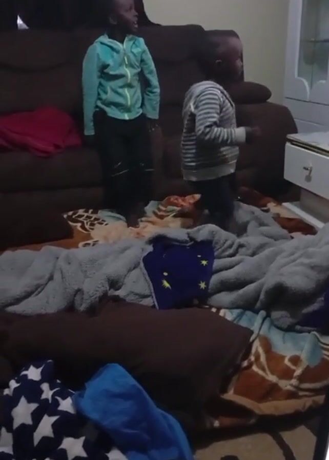 Two young African-American boys are in a living room. One boy stands on the back of a brown couch wearing a turquoise hoodie and black pants. The other boy is on the floor, which is covered with a patterned rug and several blankets and pillows. He wears a striped shirt with a hood and dark shorts. He is dancing, and at one point puts his hand on his head. Behind the couch are brown curtains. To the right of the couch is a white cabinet with a glass door.