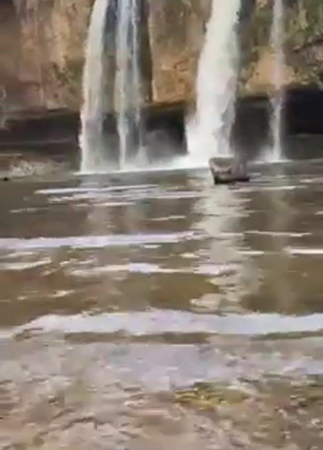 picturesque waterfall cascading over a rocky cliff into a shallow pool. Two distinct streams of water plunge downward, creating a refreshing and scenic view. The water is somewhat murky, reflecting the sky and surrounding environment. A dark, submerged object is visible in the pool, adding a touch of mystery to the scene. The sky is partly cloudy, contributing to the overall serene and natural setting.
