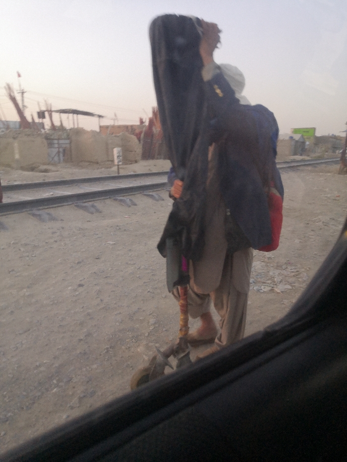 The image depicts an outdoor scene in Akhundzadakhail, Pakistan, viewed from a vehicle's interior. In the mid-ground, a solitary individual, dressed in light-colored loose trousers and a dark jacket or tunic, stands or walks on a dirt path adjacent to railway tracks. This individual appears to be carrying a long, dark object vertically against their body, consistent with the dimensions and form of a rifle or similar long weapon, grasped with both hands. A red satchel or bag is slung over their right shoulder. They are also maneuvering a rudimentary, single-wheeled handcart or trolley, constructed from wood and metal, with a handle wrapped in multicolored fabric (red, yellow, black). The individual is barefoot or wearing minimal footwear. The environment features a set of parallel railway tracks with visible sleepers, running horizontally across the mid-ground. Beyond the tracks, various makeshift structures, possibly mud-brick dwellings or informal constructions, are visible, along with taller, skeletal wooden pole structures. A white rectangular marker post with dark numbering is positioned near the tracks. The background also includes a green rectangular sign in the far distance. The sky is hazy or overcast.