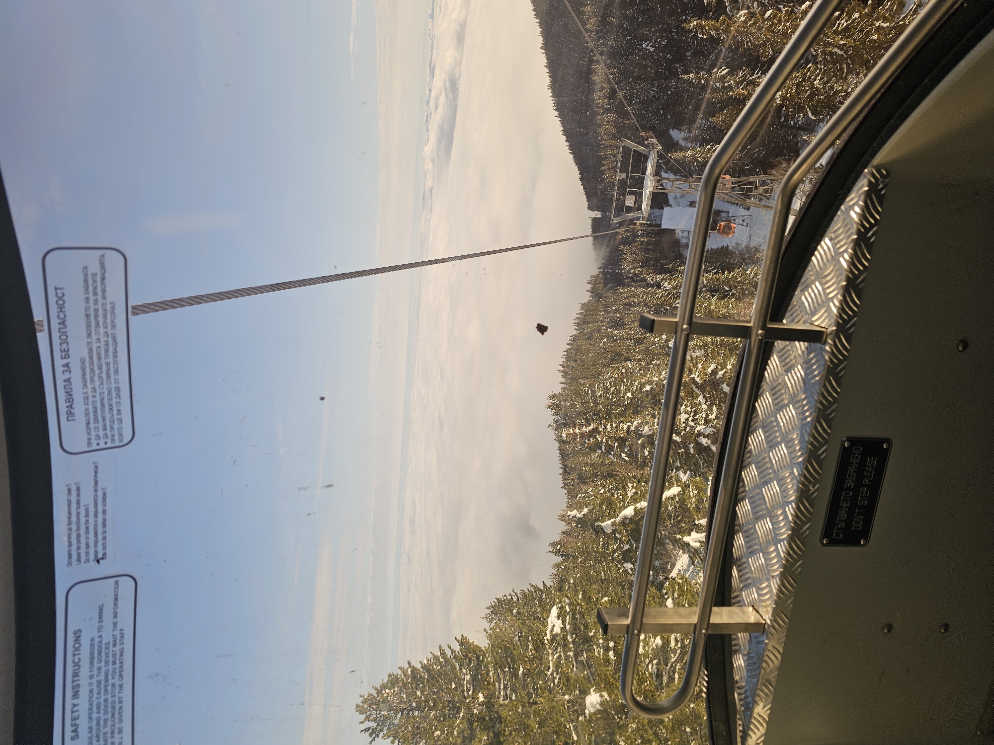 The image, taken from inside a gondola in Samokov, Bulgaria, shows a panoramic view of the landscape during winter. The perspective is from inside the gondola car, looking out across a cable and a valley filled with what seems to be a sea of clouds. Below the clouds, there are snow-covered trees. In the foreground, the gondola's safety instructions are affixed to the glass. The safety instructions are written in both English and Bulgarian. Near the gondola floor is a metal plate with the inscription "Стъпването забранено / Don't step please," indicating it is forbidden to step on this area.