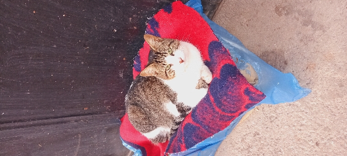 - "A domestic cat, predominantly white with brown and black tabby markings on its back, head, and tail, is resting on a red and dark blue patterned blanket" by FM-oKOCt2, licensed under CC BY 4.0