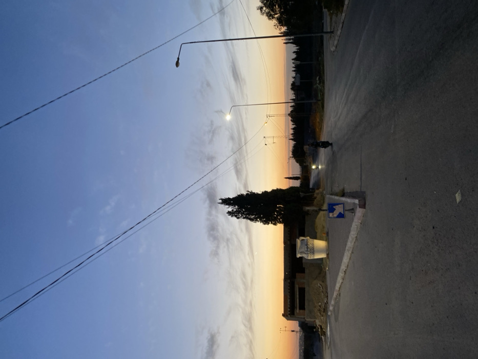 An outdoor scene at dusk shows a narrow road curving to the right. Street lights illuminate the roadway at intervals. Trees line the horizon under an orange sky giving way to blue above. A motorcycle drives along the road. A blue directional sign points left near the edge of the pavement. A building and an ornamental urn stand roadside. Power lines stretch across the sky from the upper left corner.