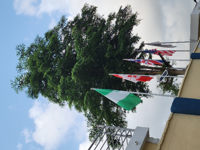 The scene, located in Lekki, Nigeria, depicts an outdoor environment featuring a line of five national flags displayed on flagpoles. From left to right, the flags are: Nigeria (green and white), Canada (red and white maple leaf), United Kingdom (Union Jack), United States of America (Stars and Stripes), and a plain light-colored flag, possibly white or grey. A large tree with dense green foliage stands prominently behind the flags, its trunk visible between the flagpoles. A small solar panel is attached to the tree's trunk. In the foreground, a yellow-painted wall with a dark blue support structure is present. To the left, a white architectural element with a grey metal railing and a white rectangular object is visible. The sky above is partly cloudy with patches of blue. No individuals are present in the image.