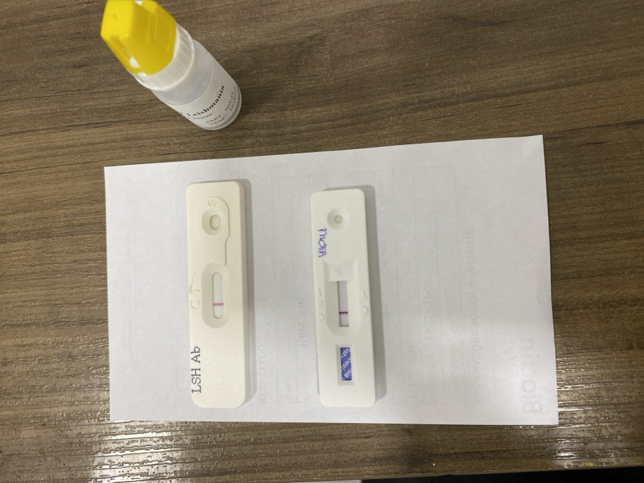The image displays two used white lateral flow immunoassay rapid test cassettes and one reagent bottle situated on a white sheet of paper atop a brown wooden surface