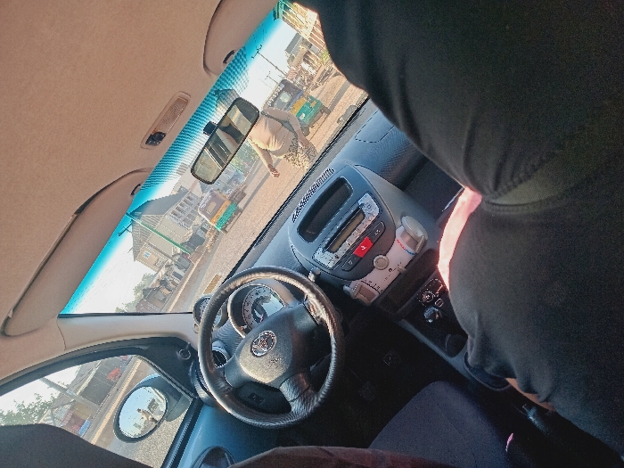 From inside a car, the interior and windshield view present a daytime street scene. Buildings and other vehicles are visible. A person stands near the driver's side window. The car's dashboard, steering wheel, and rearview mirror are prominent features. The vehicle is stationary, and the overall impression is a street-level perspective.