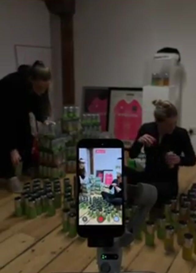 Two young women are unpacking and arranging numerous cans of the same beverage on a wooden floor in what appears to be an office or storage room. One woman, dressed in black, is seated on the floor sorting through the cans, while the other, also in black, is standing, unpacking more cans from boxes. The cans are primarily silver and green in color. The room also features a wooden column, framed posters on the wall, and additional stacks of canned beverages. A smartphone, mounted on a stabilizer, is recording the scene, showing a live image of the women and the cans. The recorded video is timed at approximately six seconds.