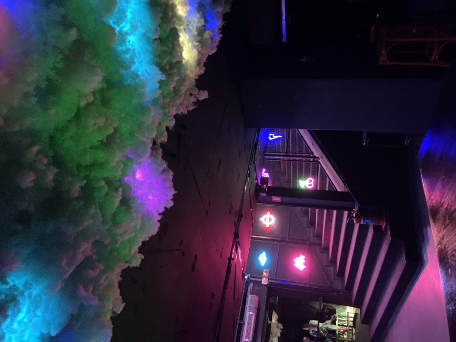 The image depicts an interior view of a nightlife establishment identified as The Maze Club, located in Sofia, Bulgaria. The primary visual feature is the ceiling, which is adorned with sculpted, cloud-like artificial structures illuminated from above by colored lights, predominantly green, blue, and purple. Below the ceiling, the environment is largely dark, with walls and structural elements appearing black or dark grey. A prominent, wide staircase descends from the upper right of the frame towards the lower left foreground. The stairs are dark, possibly black or deep grey, and are bordered by metal railings. Along the wall adjacent to the staircase, several distinctive neon signs are mounted on dark panels: a blue flying saucer (UFO), a white circular symbol, a pink "Space Invaders" alien, and a pink cherry motif. A purple stylized symbol, resembling a 'Y' or a fork, is partially visible higher on the right wall near the stairs. At the base of the stairs, a red cylindrical fire extinguisher is visible. To the far left, a dimly lit area reveals a partial view of a seating arrangement with tables and stools, where two patrons are faintly discernible, one with light-colored hair. A silver-colored air conditioning vent is mounted on the wall above this seating area. In the lower right foreground, a single red stool is present next to a dark structural pillar. The floor in the foreground reflects the ambient pink and purple lighting.