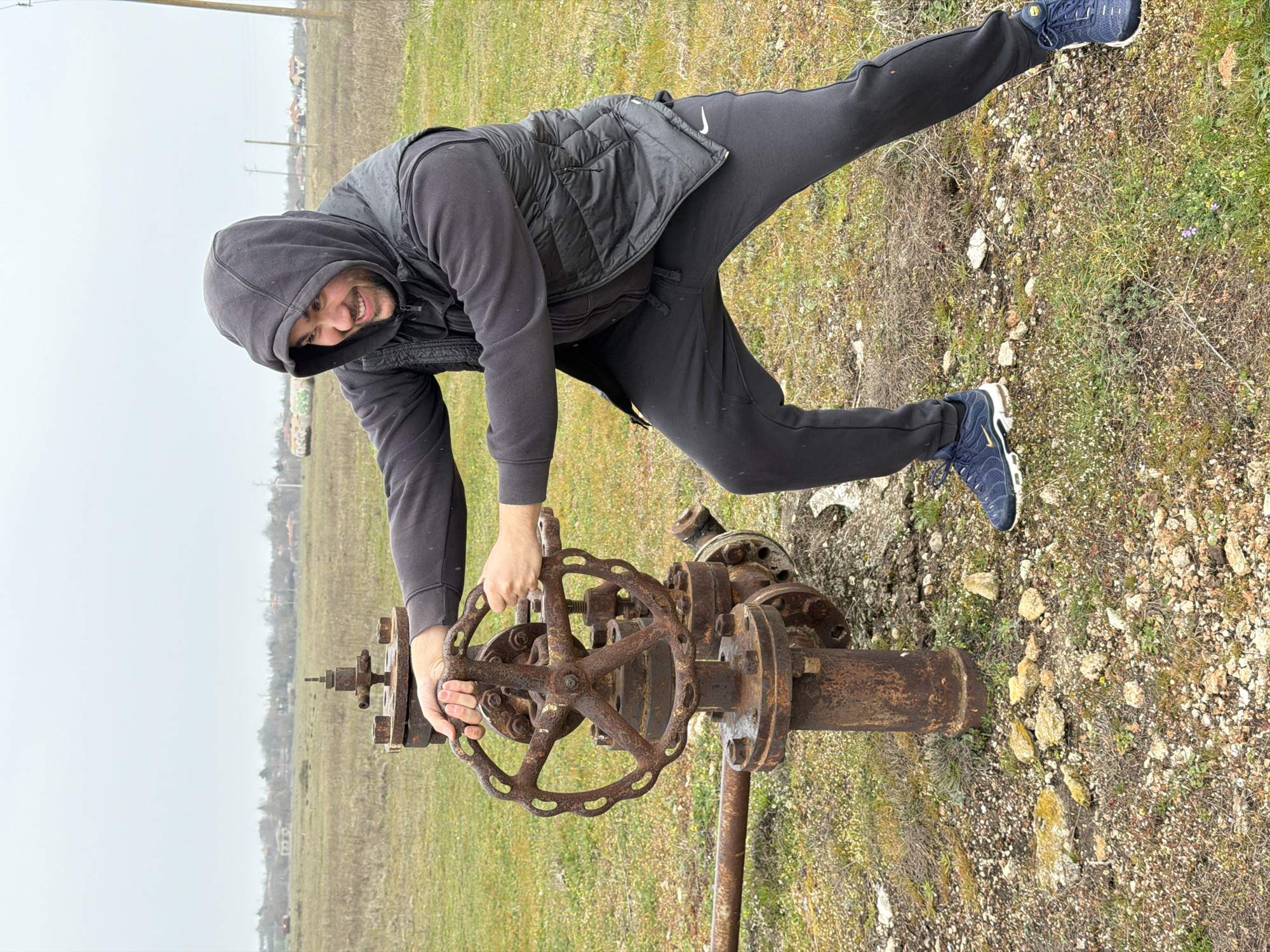 An adult male, estimated to be between 20 and 40 years old, is depicted outdoors in a rural area of Tyulenovo, Bulgaria, interacting with a heavily rusted industrial valve. The man is dressed in a dark hooded sweatshirt, a black quilted sleeveless vest, dark sweatpants with a visible white Nike logo on the upper left thigh, and dark blue Nike Air Max Plus TN sneakers. He is positioned with legs spread and knees bent, leaning forward, grasping the large, spoked, circular valve wheel with both hands, appearing to exert rotational force. His face exhibits a smile directed towards the viewer's left. The valve assembly consists of a vertical, heavily corroded metal pipe with the prominent wheel attached, and a similarly rusted horizontal pipe extending from its base towards the left. The ground is a mix of sparse, dry grasses, patches of small green vegetation, and scattered light-colored stones and gravel. In the background, a flat, undeveloped field extends to a distant horizon, where low-rise buildings with red-tiled roofs, scattered deciduous trees, utility poles, and a large, partially visible, graffiti-covered cylindrical object are present under an overcast grey sky.