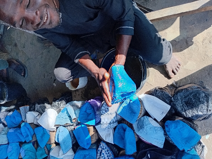 The image depicts an outdoor textile dyeing operation in Sharada, Nigeria