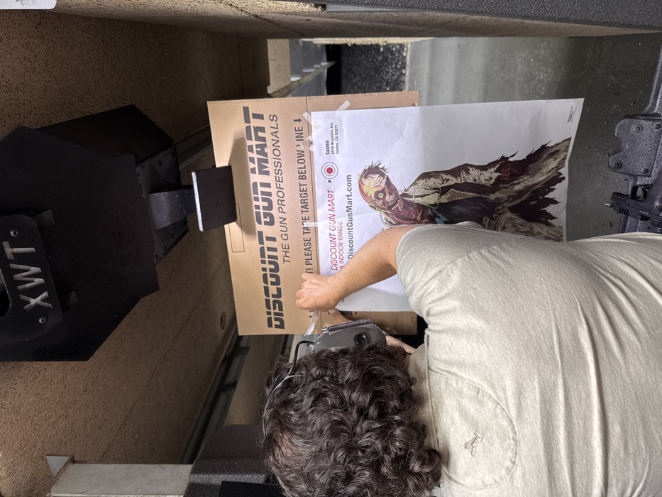 The image depicts an indoor shooting range lane at Discount Gun Mart, 8515 Magnolia Ave, Santee, San Diego County, California, USA. A person, viewed from the back, with dark curly hair and wearing a light-colored polo shirt, is affixing a paper shooting target to a cardboard backer using clear adhesive tape. The individual is wearing grey over-ear hearing protection. The paper target displays a zombie illustration and includes "DiscountGunMart.com" and the Santee address. The larger cardboard backer is branded "DISCOUNT GUN MART". A black handgun, consistent with a Glock model, rests on a black textured surface in the lower right foreground. The surrounding environment includes tan sound-absorbing wall panels and a black metal target carrier system marked "XWT".