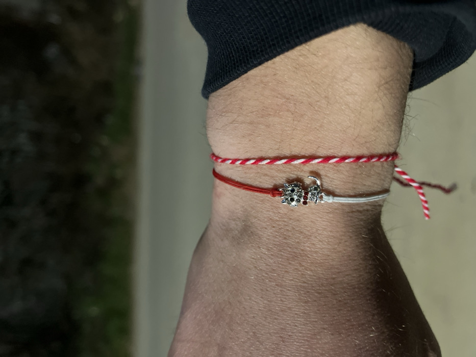 A human left forearm and wrist are depicted, positioned in Dolni Chiflik, Bulgaria. The arm is lightly haired, and a dark-colored sleeve is visible on the right side, suggesting a long-sleeved garment. Three distinct bracelets are worn on the wrist: one consisting of a thin red string, one made of red and white twisted string, and a third featuring a silver-colored cat charm with clear and red rhinestone embellishments, attached to a thin white string. The background is out of focus, showing a light-colored ground surface behind the arm, with a darker, blurry area suggesting foliage or distant structures under ambient lighting. No active interactions are observed; the items are stationary on the arm.