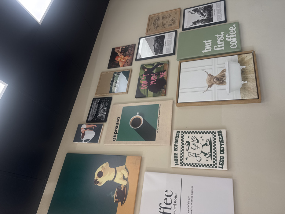 The image displays a light-colored wall adorned with a gallery of framed and unframed artworks, primarily centered on a coffee theme, located in a commercial establishment in Glendale, United States