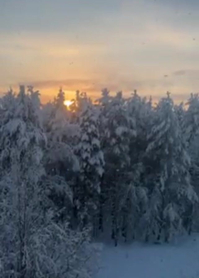The video captures a winter scene featuring a snow-covered forest set against a colorful sunset