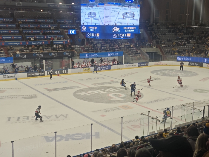 An ice hockey game unfolds on a rink with team logos and sponsor advertisements