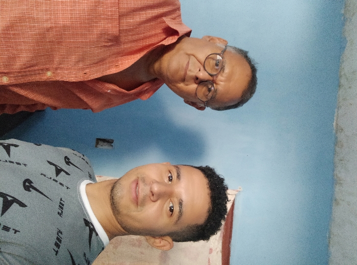 Two men pose for a selfie indoors against a light blue wall. The younger man, wearing a grey Tesla-printed shirt, is positioned at the bottom. Above him is an older man with glasses, wearing an orange button-down shirt. The image is rotated counter-clockwise. A beige headboard or wall section is visible behind the younger man.