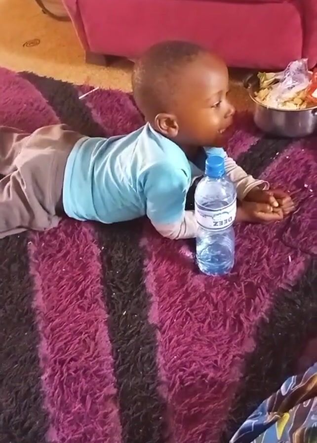 A young child is lying prone on a purple and black rug in an indoor setting. The child is wearing a light blue shirt and grey pants. A bottle of water with a blue cap is lying beside the child. There is a metal bowl filled with contents near the upper right of the frame. A red sofa is in the background. The child looks around and utters a word that sounds like "guy."