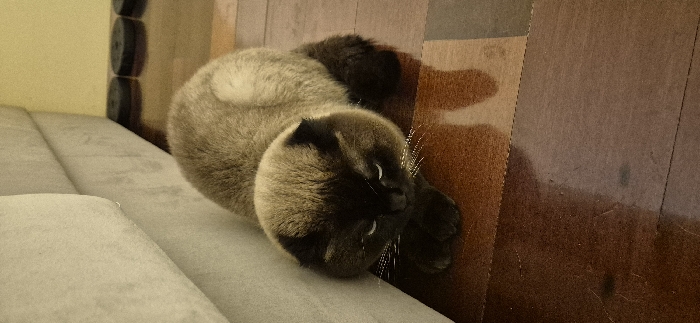 The image displays an indoor scene featuring a Scottish Fold cat resting on a polished wooden floor. The cat's fur presents a colorpoint pattern, with dark brown to black coloration on its face, ears, and paws, contrasting with a lighter tan or fawn on its body. Its eyes are partially closed, exhibiting reflective white or light blue highlights. White whiskers are visible extending from its muzzle. The cat is lying down with its front paws tucked beneath its chest, facing forward. To the immediate left of the cat is a light beige or grey upholstered sofa or couch. In the background, to the right of the cat, a light yellow wall is visible. Against this wall, on the wooden floor, are three dark, circular objects arranged in a linear fashion, consistent with furniture pads. The wooden floorboards exhibit varying shades of brown and reflective properties. No human presence or direct interaction is observed. This scene is located in Sofia, Bulgaria.
