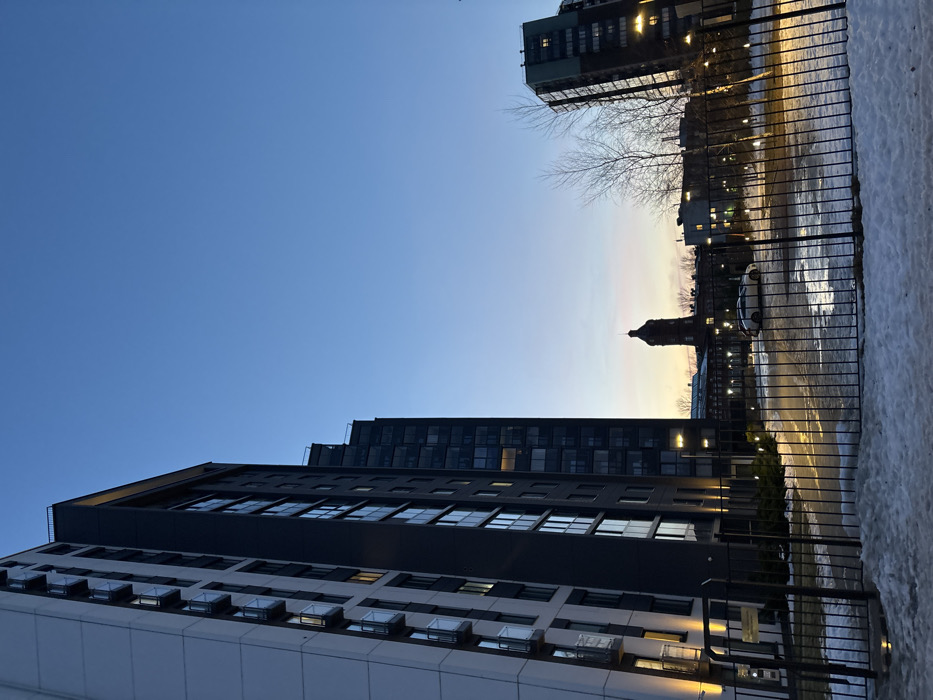 The image depicts an urban scene in Saint Petersburg, Russia, specifically within the vicinity of Shpalernaya Street 56. The prominent landmark in the mid-ground is the silhouette of the historic Saint Petersburg Water Tower, distinguishable by its distinct domed cupola. The sky above transitions from a deep blue at the zenith to a pale yellow-orange at the horizon, indicating either dawn or dusk. In the foreground, a black metal fence with vertical bars separates the viewer from an interior courtyard or paved area. Patches of dirty snow and ice are present on the ground both outside and inside the fence line. To the left, a tall, modern residential building with a multi-paneled facade of light grey and dark sections rises vertically, featuring multiple balconies and several illuminated interior windows. A second, darker modern building stands partially visible behind it. To the right, another tall, dark-colored residential building is also visible, with some illuminated windows. Within the fenced area, a paved driveway or pathway is visible, reflecting light from ground-level floodlights. A white sedan is parked on this paved surface in the mid-ground. Bare deciduous trees are scattered within the scene, particularly in the middle distance. The overall environment suggests a cold, winter setting during twilight hours.