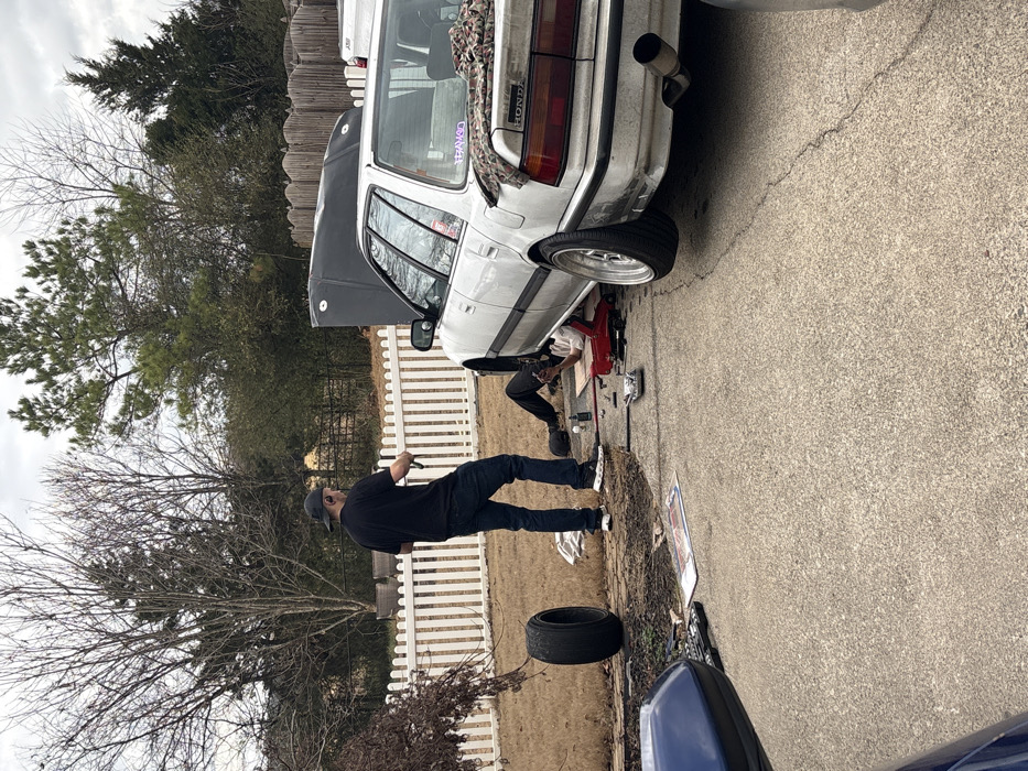 A white Honda wagon is parked on an asphalt driveway with its hood open. A person is working beneath the car using a red jack. A man stands nearby in a black shirt, jeans, and a baseball cap, holding a tool. A tire lies on the ground near a white picket fence. Bare trees and green foliage surround the scene. A blue car's hood is visible in the foreground. The sky is overcast.