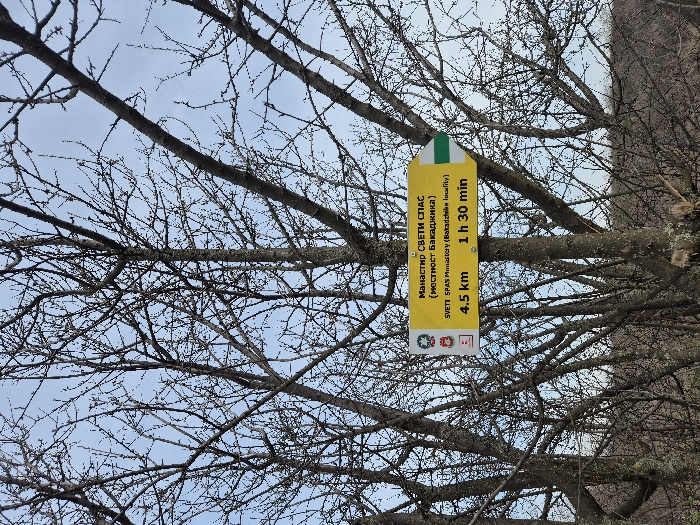 - "A yellow rectangular directional sign, affixed to a bare deciduous tree, is positioned in a wooded area under a clear light blue sky" by FM-RLBpB3, licensed under CC BY 4.0