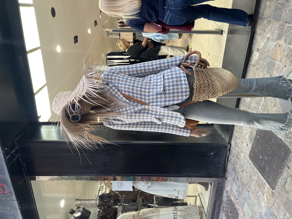 The image displays a street scene in Cannes, France, centered on a fashion mannequin positioned on a cobblestone sidewalk. The mannequin is adorned with a large, wide-brimmed straw hat featuring an extensive fringe, oversized white sunglasses, a light blue and white checkered blazer over a white shirt, and light-wash flared jeans with frayed hems. It carries a tan leather cross-body bag and a two-toned woven straw bucket bag with dark leather-wrapped handles. To the mannequin's left, a retail store's display window is visible, showcasing additional mannequins and garments, including a white dress. String lights are strung across the top of the window frame, and a white sign with French text, "C'est le prix...", is partially visible. A dark, possibly black, building facade borders the window and extends to the store's entrance on the right. Through the open entrance of the store, marked with an "L & B" sign above, two adult females are visible inside. One woman, with blonde hair and glasses, is seen from the side, wearing a dark top and light trousers, engaged in browsing clothing racks. A second woman, with long blonde hair, is seen from behind, wearing a navy blue short-sleeved top and blue jeans, standing near the entrance with a maroon garment draped over her left arm. The store interior features overhead lighting and further clothing displays. A metal grate with a hexagonal pattern is present on the pavement in the foreground.