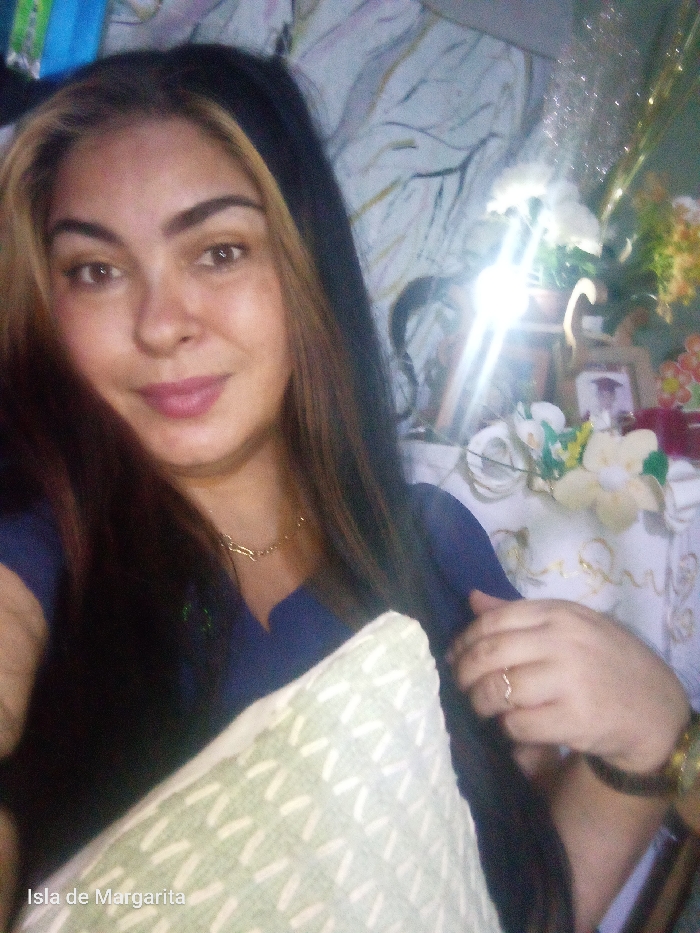 A woman with long brown hair with blonde streaks poses for a selfie. She wears a dark blue shirt and a gold necklace. A patterned light green pillow obscures part of her shirt. She also wears a ring on her left hand and a watch on her right. Behind her is a floral arrangement with a picture frame. The image has a slight glare and the text "Isla de Margarita" at the bottom.